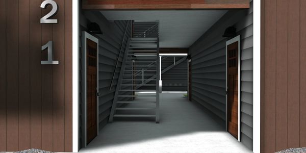 The client wanted to develop a great apartment building that would meet code and require little in maintenance and utility costs–a good investment development. Typically the number of units in the building would require an elevator system and more extensive fire protection systems, the initial concept also required a large area of common space which would need to be heated and maintained without producing any income for the property.